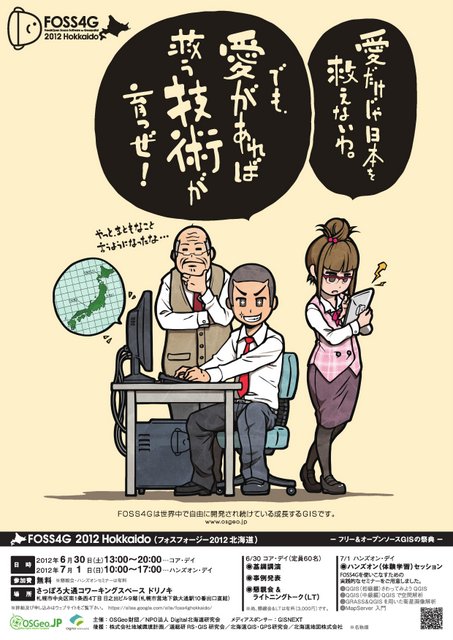 B1サイズ(約6MB)はこちら | A4サイズ(約2.5MB)はこちらFOSS4G 2012 Hokkaidoフライヤー画像